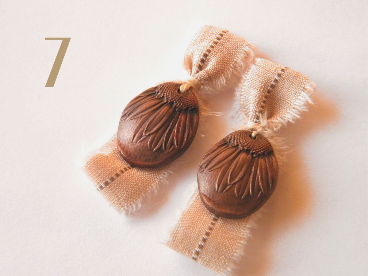 These earrings are my first jewelry of the new year and such fun to make! I wanted something to match a favorite top and to coordinate with other things too, so I went with one of my favorite colors: copper brown… I added in sprinkling of blue to match my blue jeans… and then chose a neutral toned fabric to tie it all together because I just love that rustic look it adds to my designs.