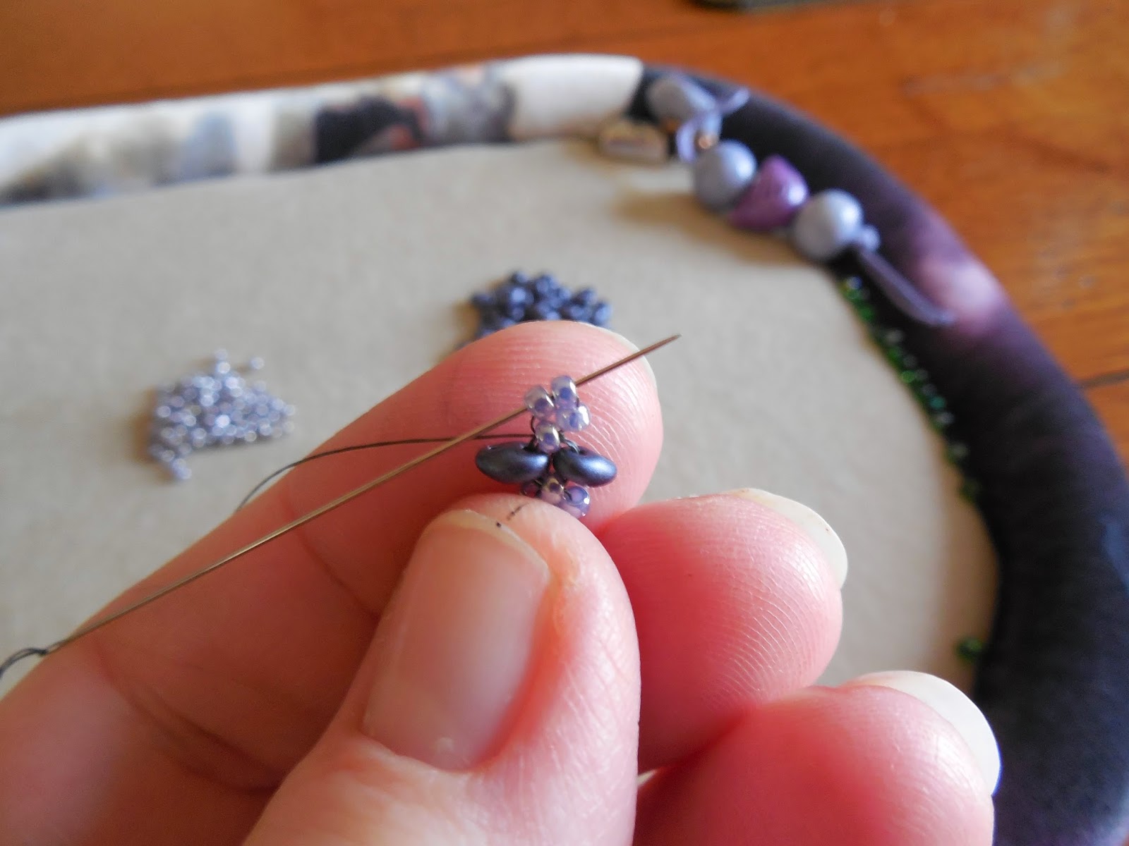 | Start with 11/0 seed beads and coordinating twin beads. |