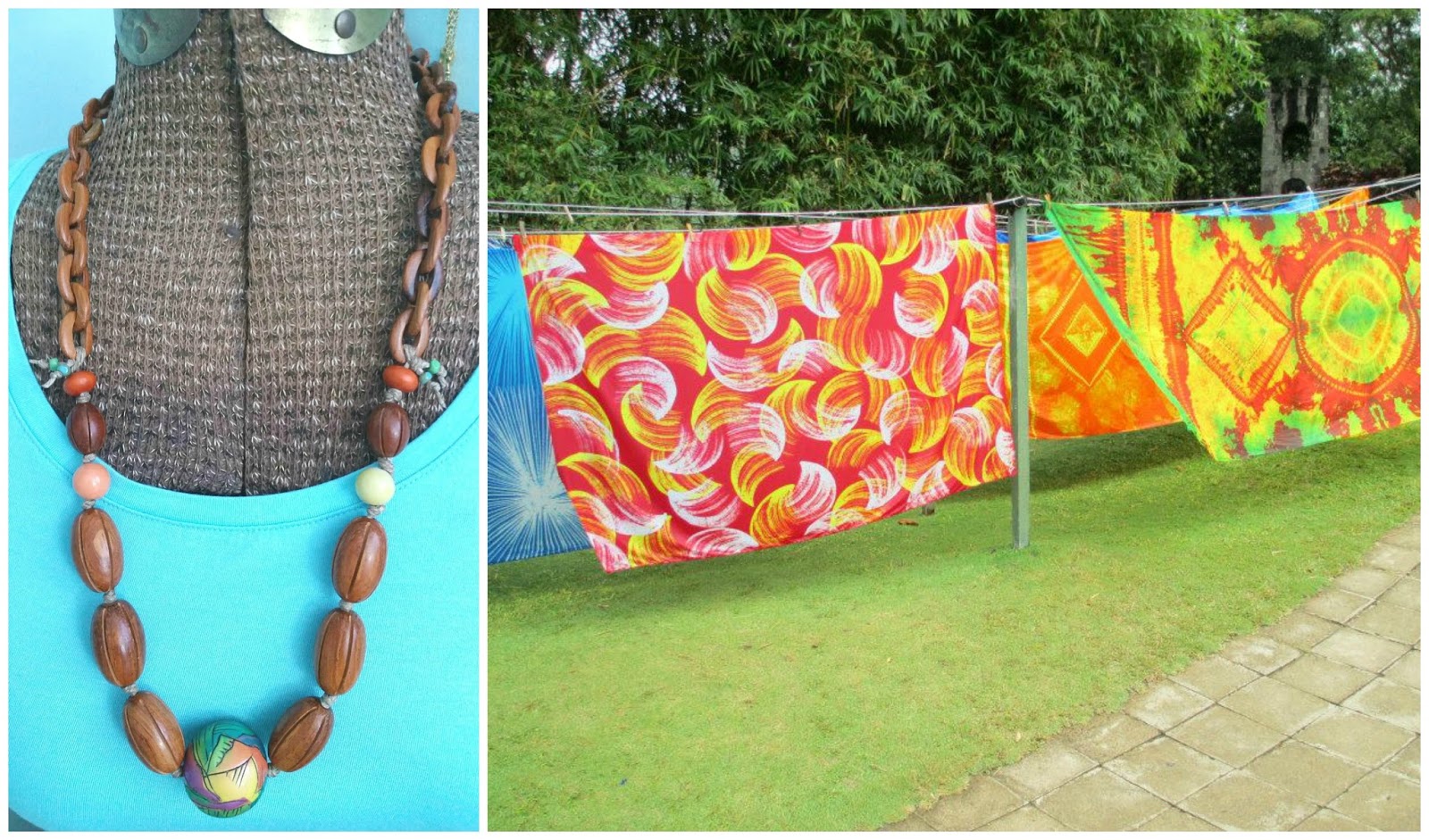 | Left: Chunky tropical necklace Right: Batik factory, St. Kitts |